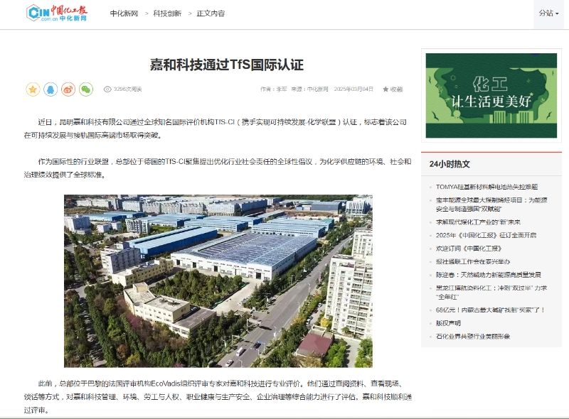 近日,昆明嘉和科技有限公司通過全球知名國(guó)際評(píng)價(jià)機(jī)構(gòu)TfS-(1(攜手實(shí)現(xiàn)可持續(xù)發(fā)展-化學(xué)聯(lián)盟)認(rèn)證,標(biāo)志著該公司在可持續(xù)發(fā)展與接軌國(guó)際高端市場(chǎng)取得突破。