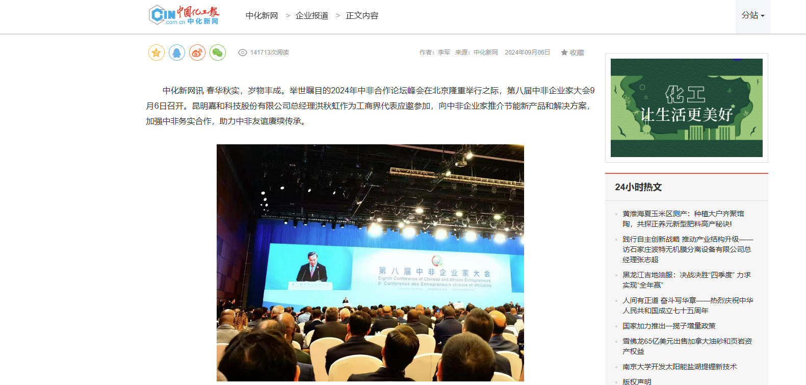 中化新網(wǎng)訊春華秋實(shí),歲物豐成。舉世矚目的2024年中非合作論壇峰會(huì)在北京隆重舉行之際,第八屆中非企業(yè)家大會(huì)9月6日召開。昆明嘉和科技股份有限公司總經(jīng)理洪秋虹作為...