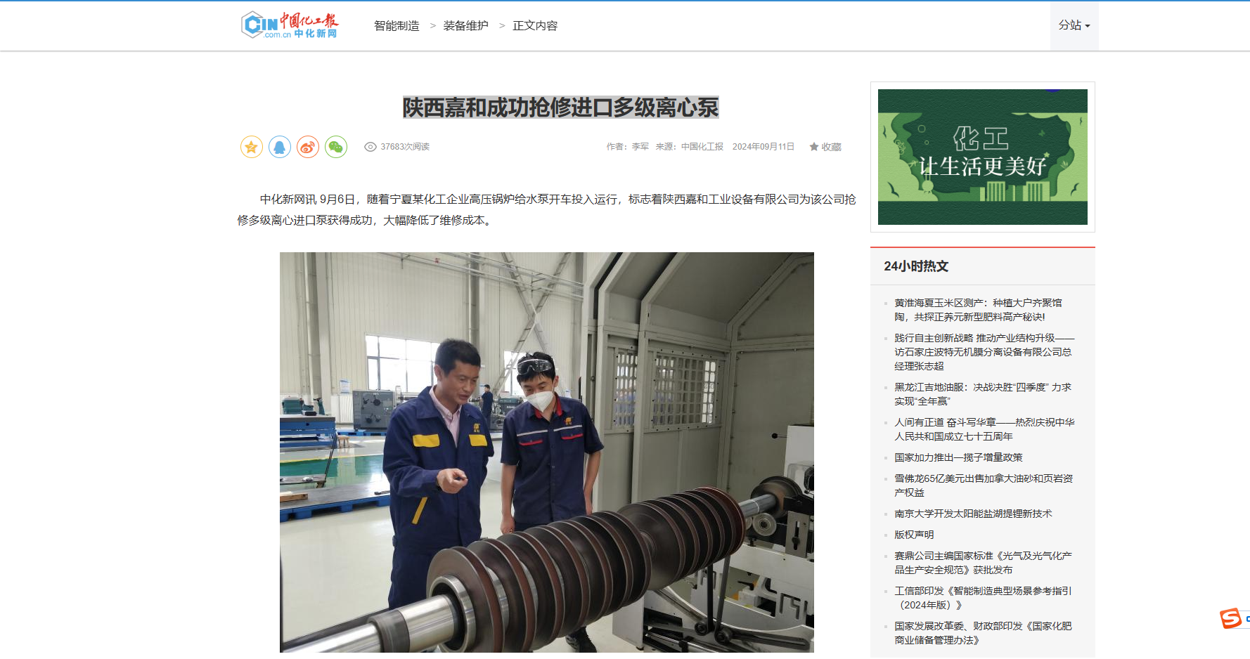 陜西嘉和成功搶修進(jìn)口多級(jí)離心泵