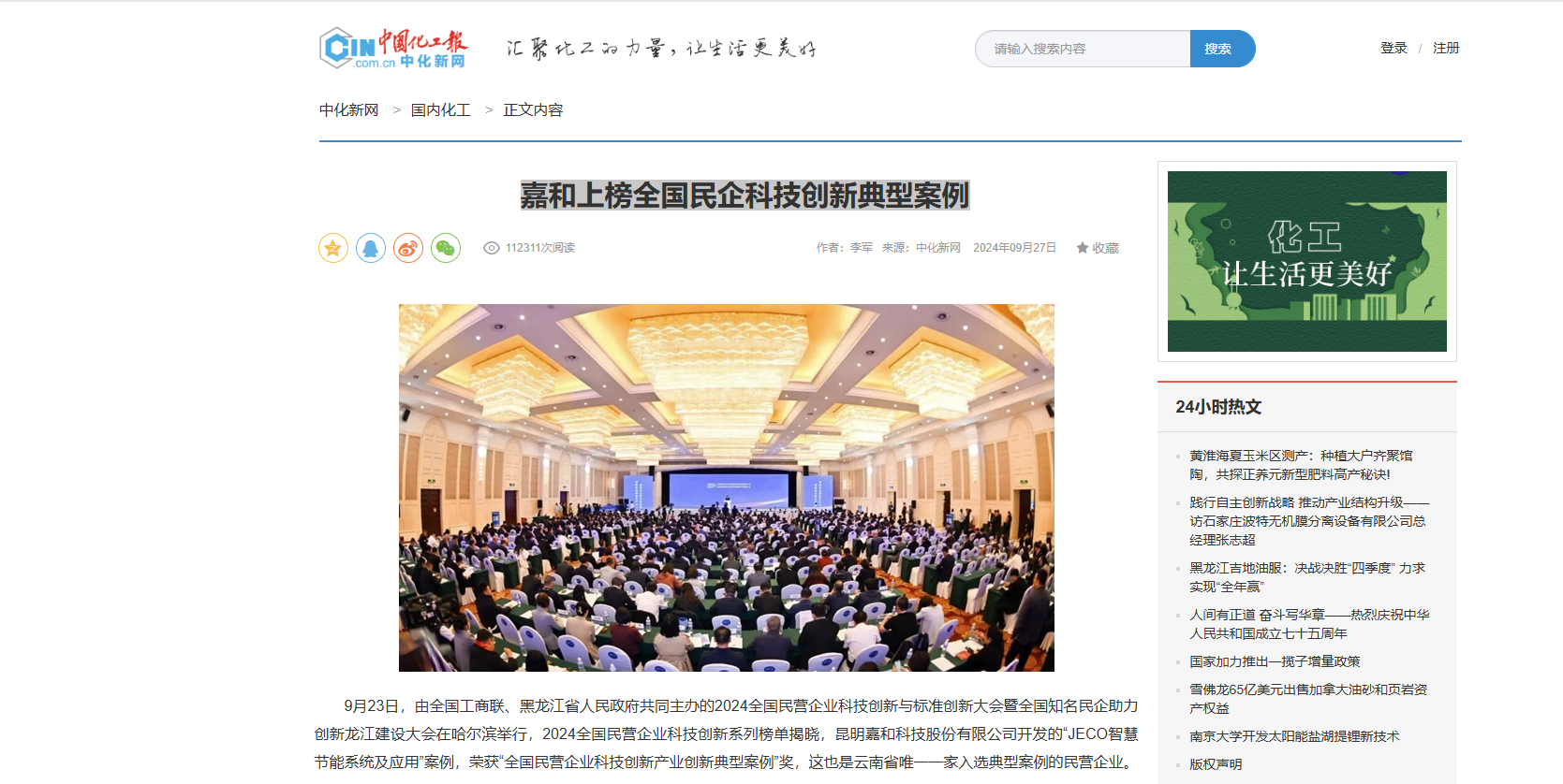 近日,2024全國(guó)民營(yíng)企業(yè)科技創(chuàng)新系列榜單在黑龍江哈爾濱揭曉,昆明嘉和科技股份有限公司(以下簡(jiǎn)稱嘉和科技)開發(fā)的“JECO智慧節(jié)能系統(tǒng)及應(yīng)用”案例,入選“全國(guó)民...