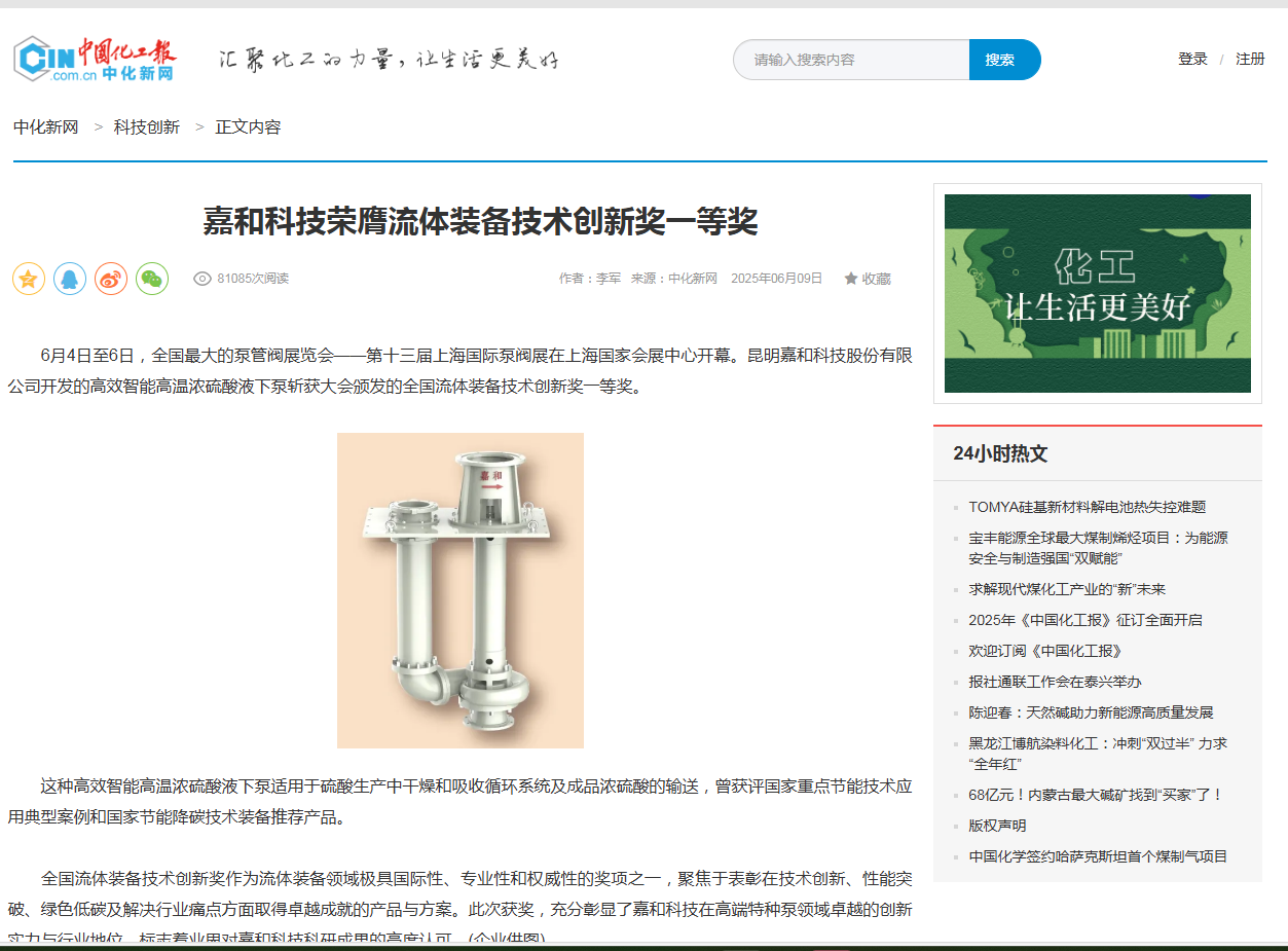 近日,昆明嘉和科技股份有限公司研發(fā)的高效智能高溫濃硫酸液下泵,入選中國(guó)石油和化學(xué)工業(yè)聯(lián)合會(huì)《石化行業(yè)轉(zhuǎn)型升級(jí)先進(jìn)工藝、技術(shù)、設(shè)備名錄(2025年版)》。