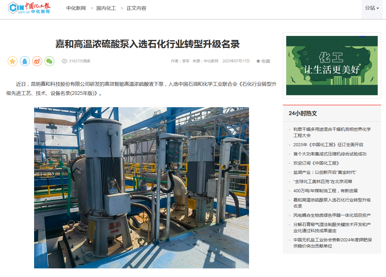 嘉和高溫濃硫酸泵入選石化行業(yè)轉(zhuǎn)型升級(jí)名錄
