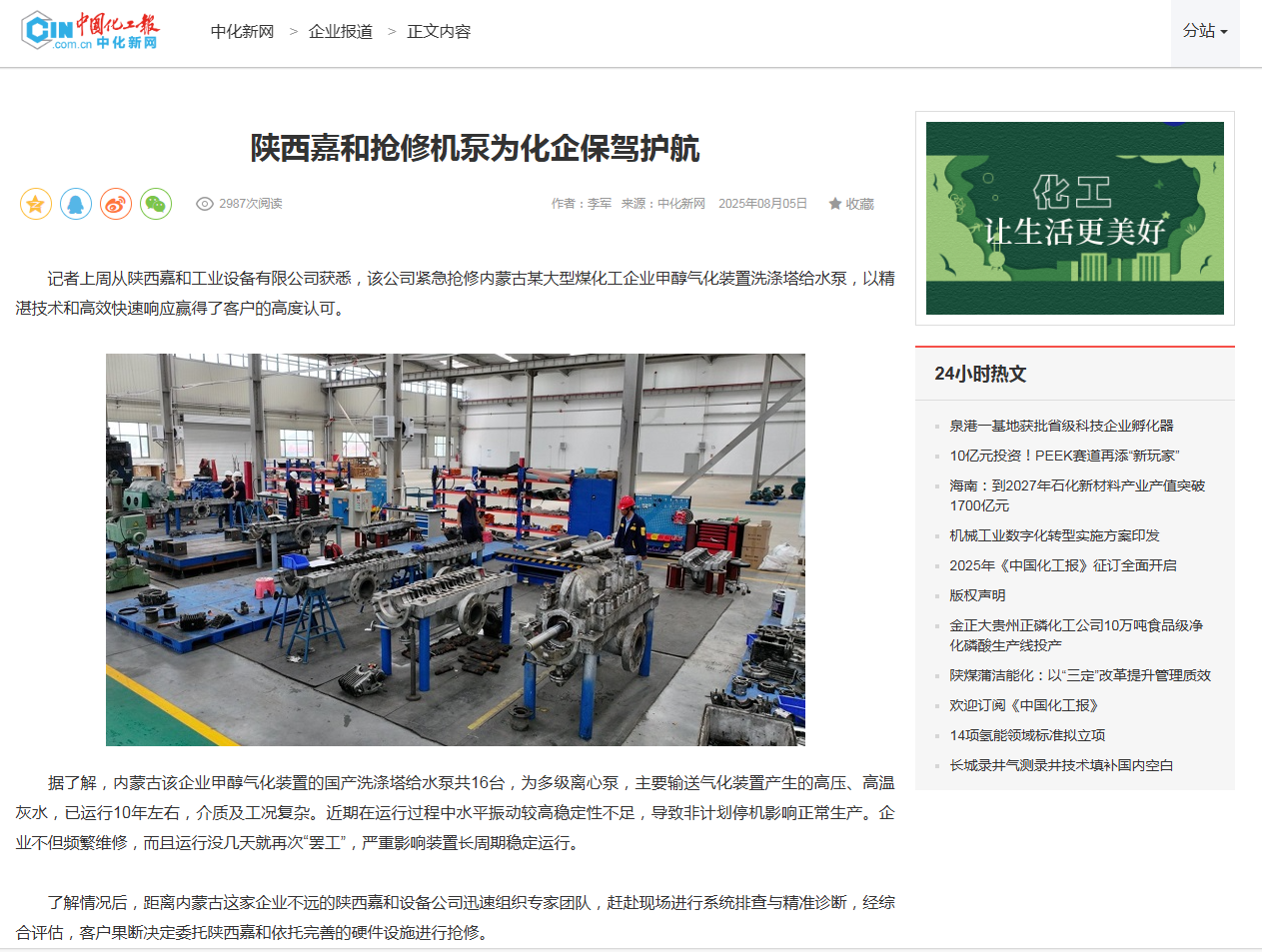 記者上周從陜西嘉和工業(yè)設(shè)備有限公司獲悉,該公司緊急搶修內(nèi)蒙古某大型煤化工企業(yè)甲醇?xì)饣b置洗滌塔給水泵,以精湛技術(shù)和高效快速響應(yīng)贏得了客戶的高度認(rèn)可。